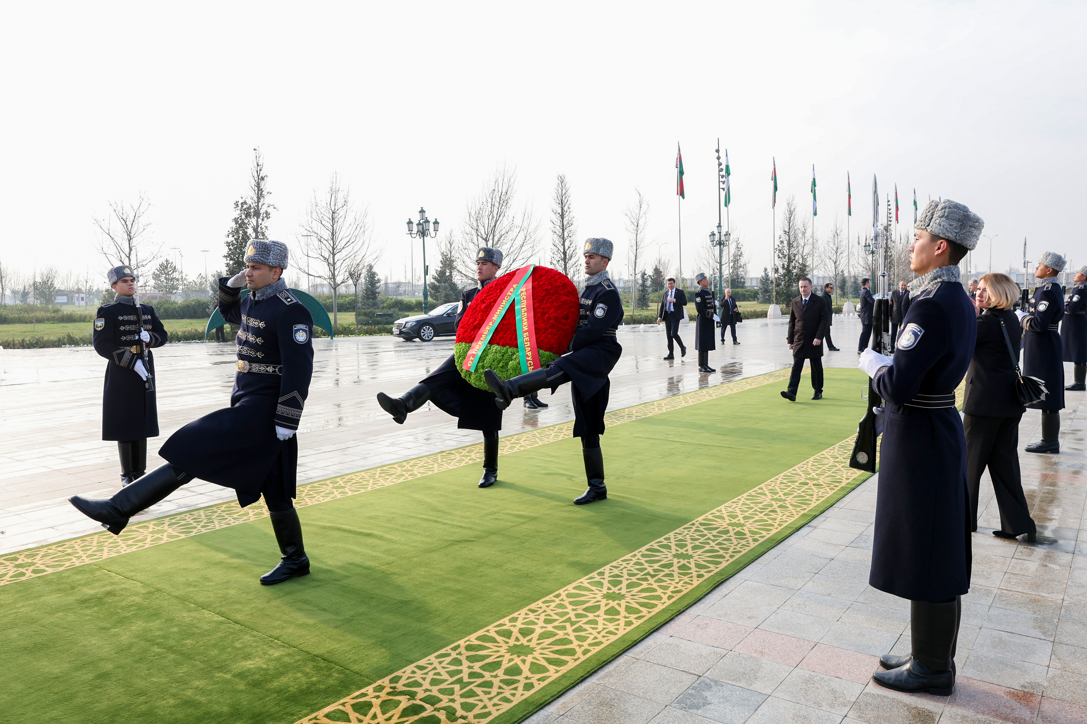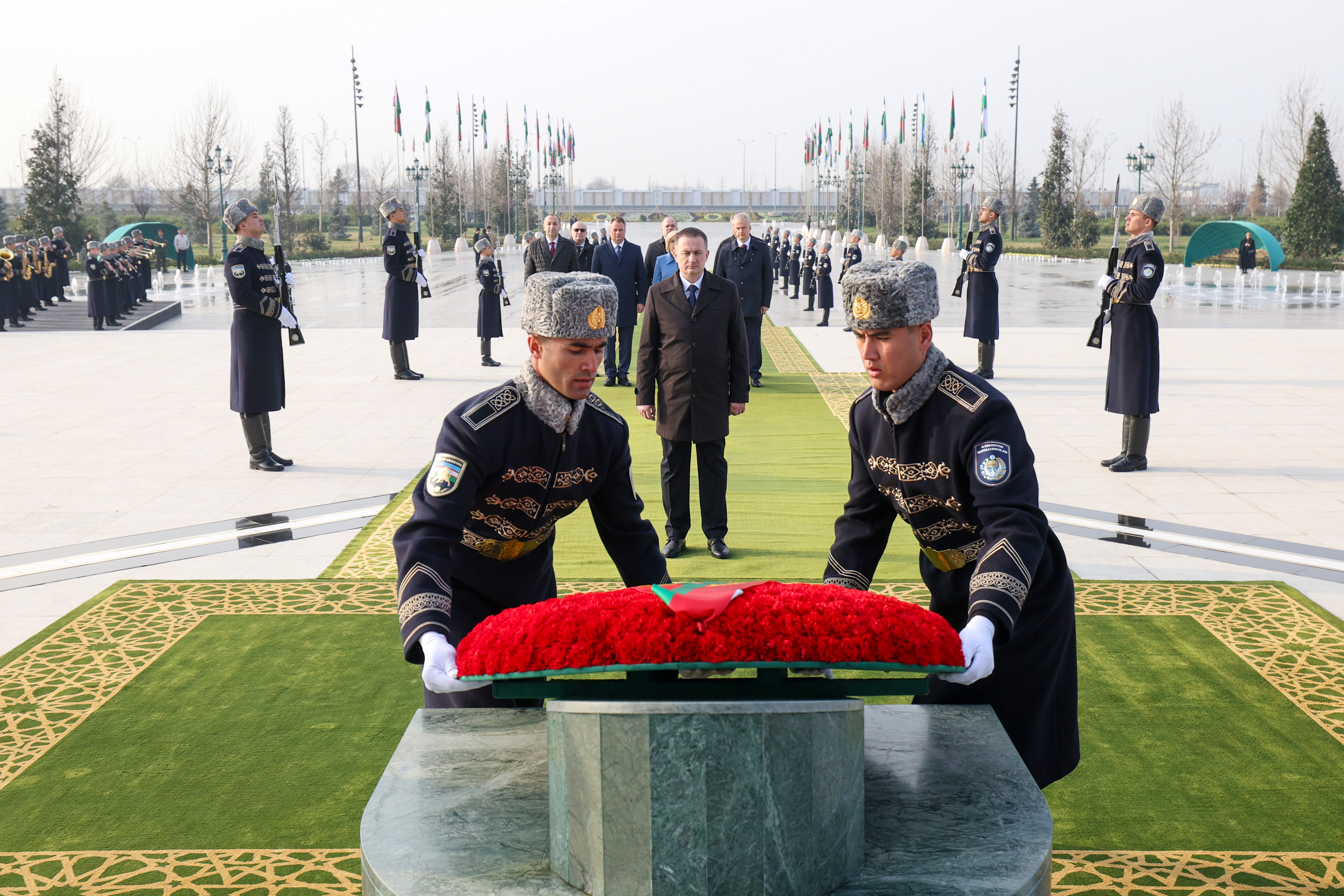 Премьер-министр Беларуси Александр Турчин возложил венок к Монументу Независимости в парке «Янги Узбекистон» - 60-метровой стеле, увенчанной инсталляцией птицы Хумо, которая является символом мира, процветания и свободы.